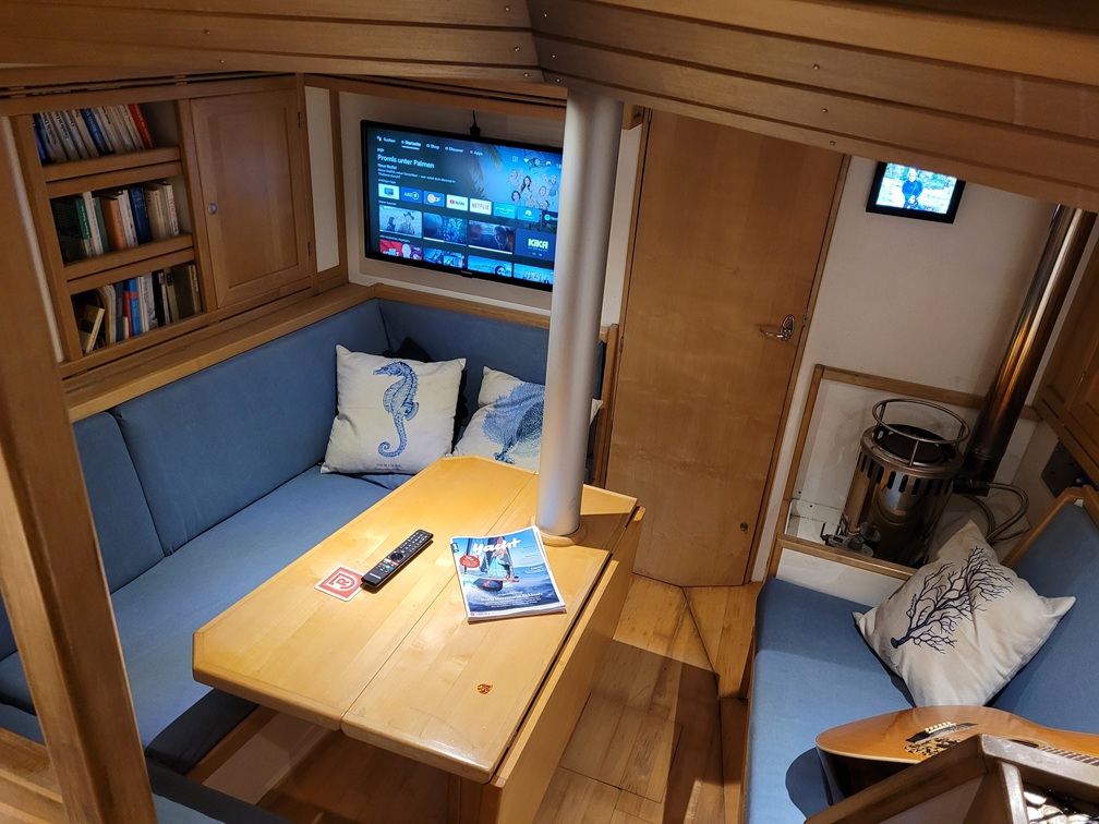 Für kalte Tage und Nächte gibt es einen Refleks-Kutterölofen aus Edelstahl mit Wasserschlange und zwei angeschlossenen Heizkörpern im Bad und in der Eignerkabine.