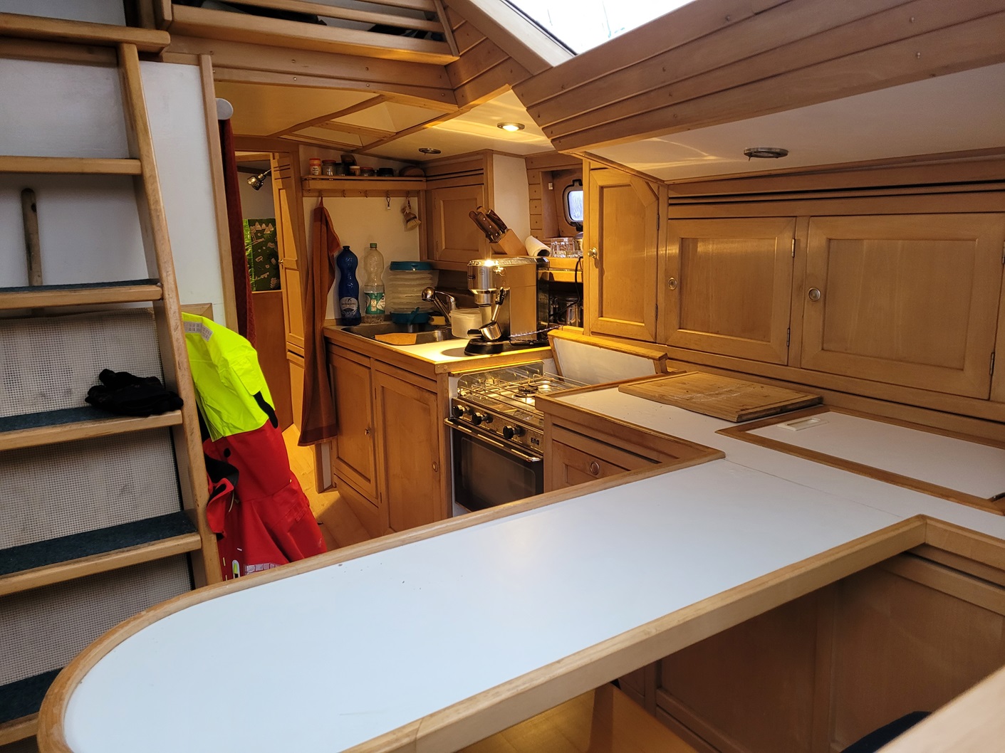 Der Vorbesitzer war ein Tischler und hat die Aaris innen komplett selbst geschreinert, mit hellem Holz in Ahorn sieht sie innen eher aus wie eine gemütliche Almhütte, das hat mir schon gleich sehr gefallen.