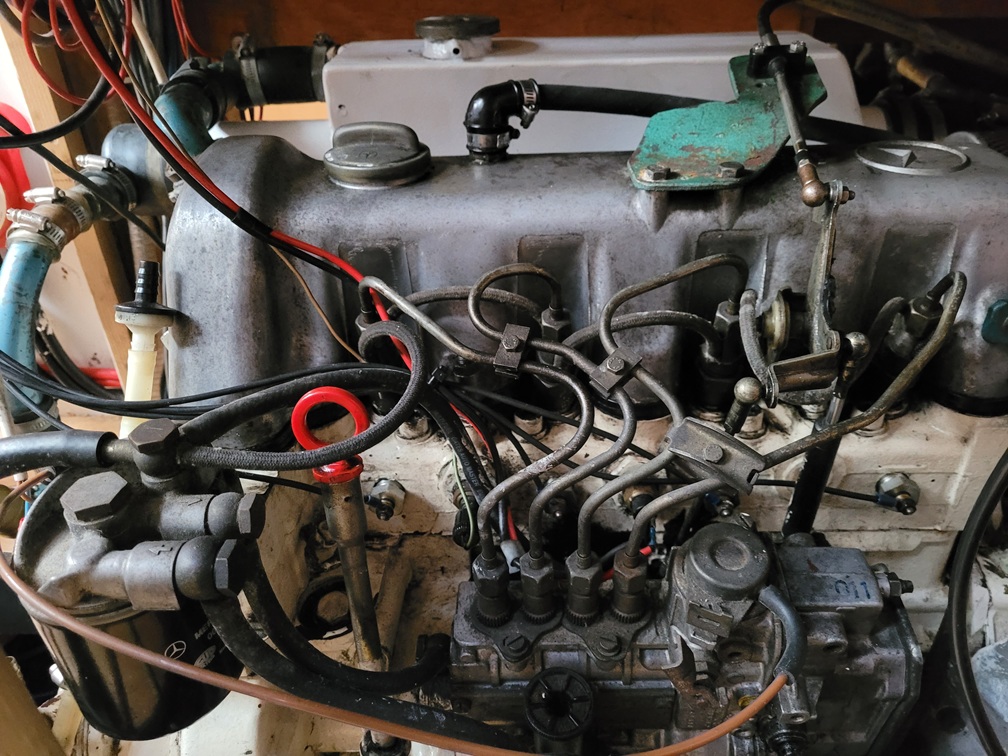 Der Motor als Flautenschieber und für Hafenmanöver, ist ein Pkw-Motor OM616 von Mercedes Benz, bekannt als 123er 240D mit 72 PS, marinisiert in Zweikreiskühlung. An einer Welle wird die Aaris mit einer 3-flügeligen festen Schraube angetrieben.