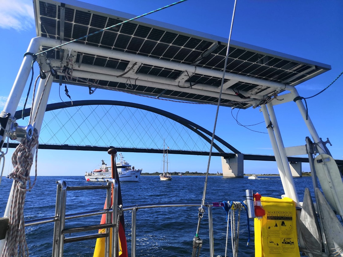 Die Photovoltaik auf dem Heckträger sowie die absenkbaren Davits für das Beiboot (im Hintergrund die Brücke zur Insel Fehmarn)