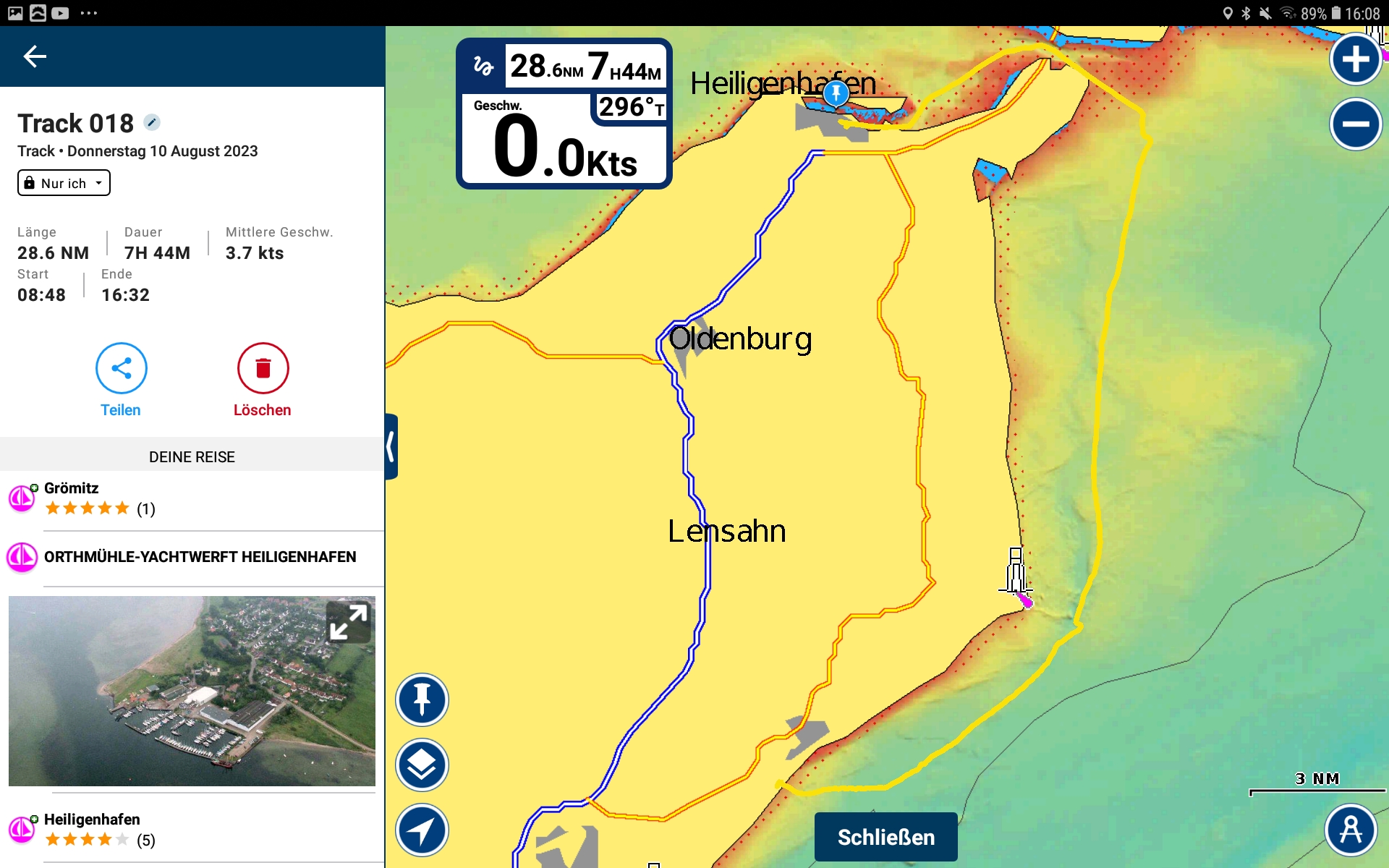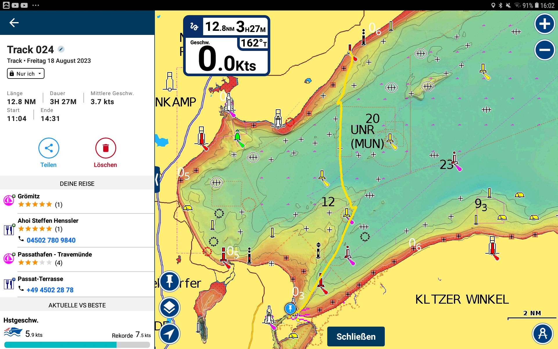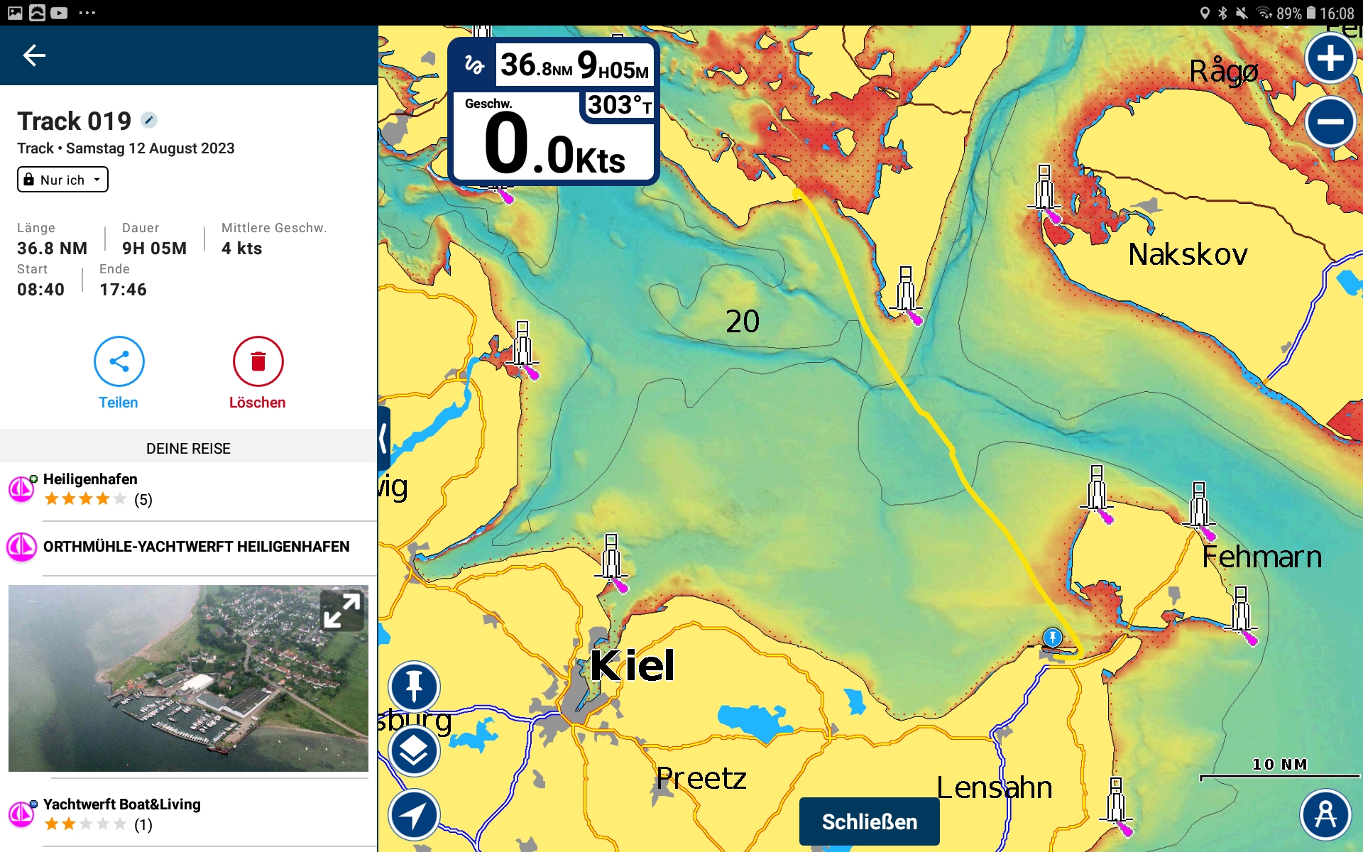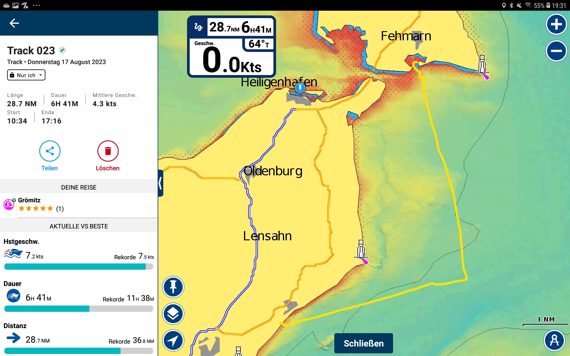 | Bemerkungen: Track 042: Wir entschieden in der Nacht zu fahren, da wir hier besseren Wind haben, als am nächsten Tag. Da hätten wir den Wind nur auf der Nase gehabt und wahrscheinlich 36 sm motoren müssen. Diese Nachtfahrt hatte es in sich: Es wurden 14 - 16 Ktn Wind vorausgesagt, es waren aber dann tatsächlich 18 - 25 Ktn bei 1m kurzer Welle die aber dann vor der Kieler Förde weniger wurde. Es war aber mächtig Bewegung im Schiff. An dieser Fahrt merkt man einfach die Erfahrung von Sepp, der hier sehr viel das Ruder hatte und die Segel sehr gut trimmte. Wir hatten aber ab 00:30 mit starkem Regen zu kämpfen, gut ist hier unsere Sprayhood unter der man sich geschützt aufhalten kann. Da wir den Kurs direkt auf die Kieler Förde nicht halten konnten, mussten wir eine Wende machen und die letzten 9 sm mit Maschine fahren. Wir sind glücklich in Laboe um 05:10 Uhr eingelaufen, mussten allerdings noch ca. 30min einen freien Liegeplatz suchen. Übermorgen startet hier in Kiel ein großes Event mit einem Fest für das Ocean Race Europe, welches am 10. August startet. Boris Hermann wird hier mit seiner Crew starten. Er wird uns vermutlich, ausser wir sind schneller ;-), auf der Nordsee überholen, vielleicht sende ich einen Funkspruch zu Boris ob ich zur Seite gehen soll :-)