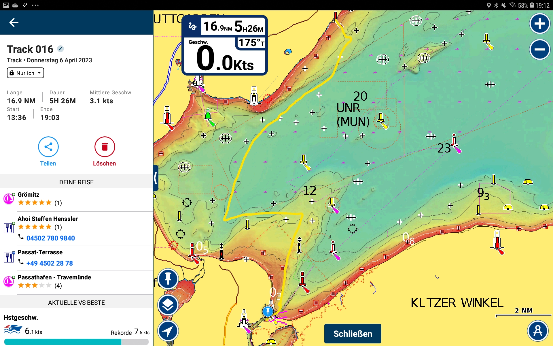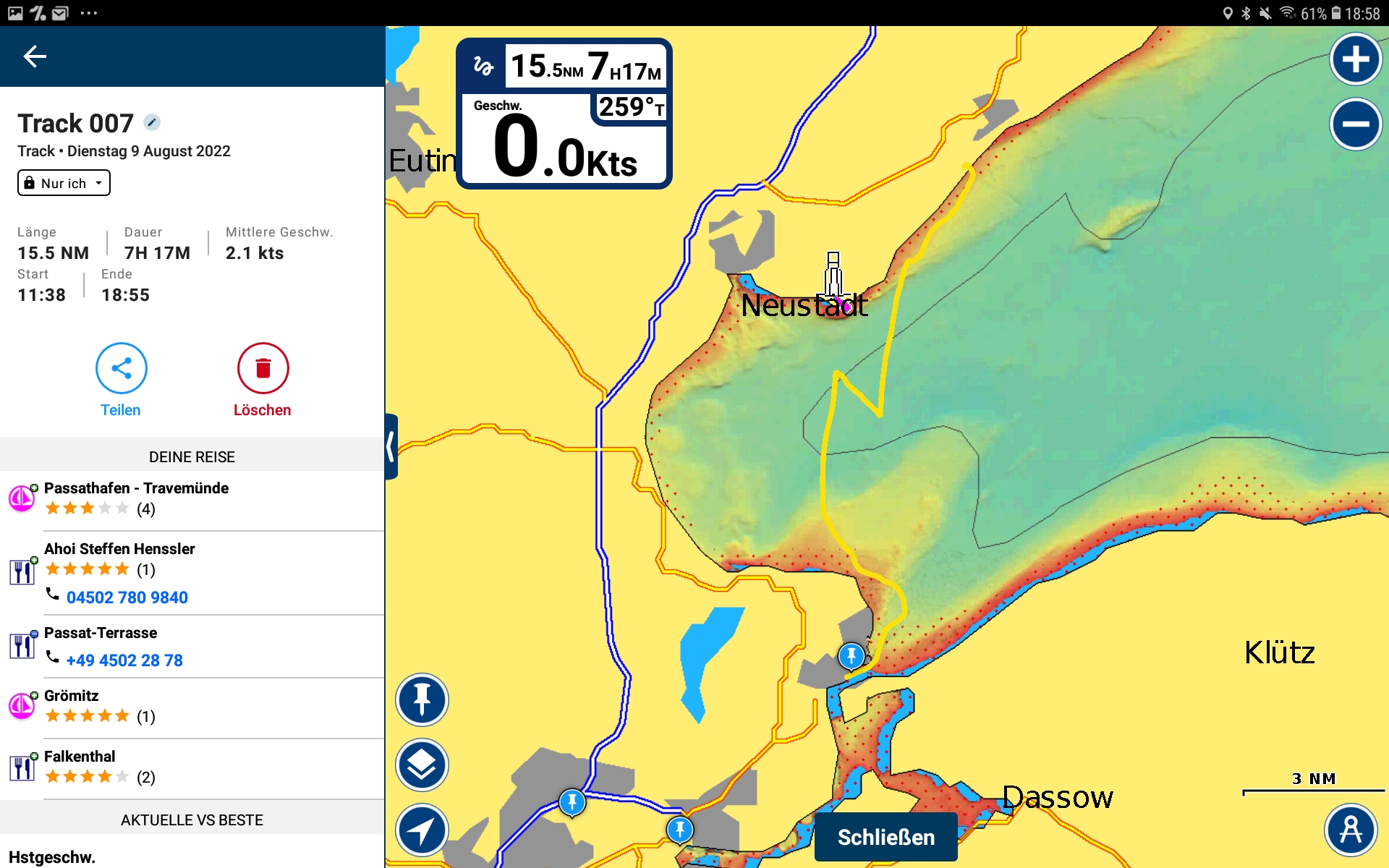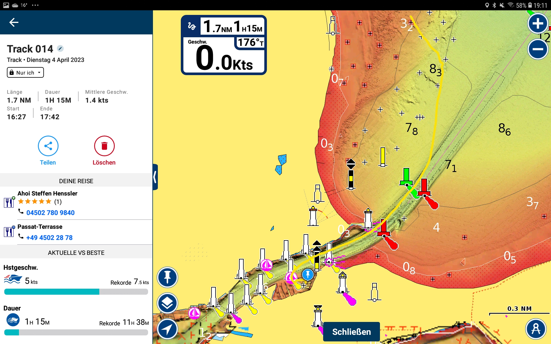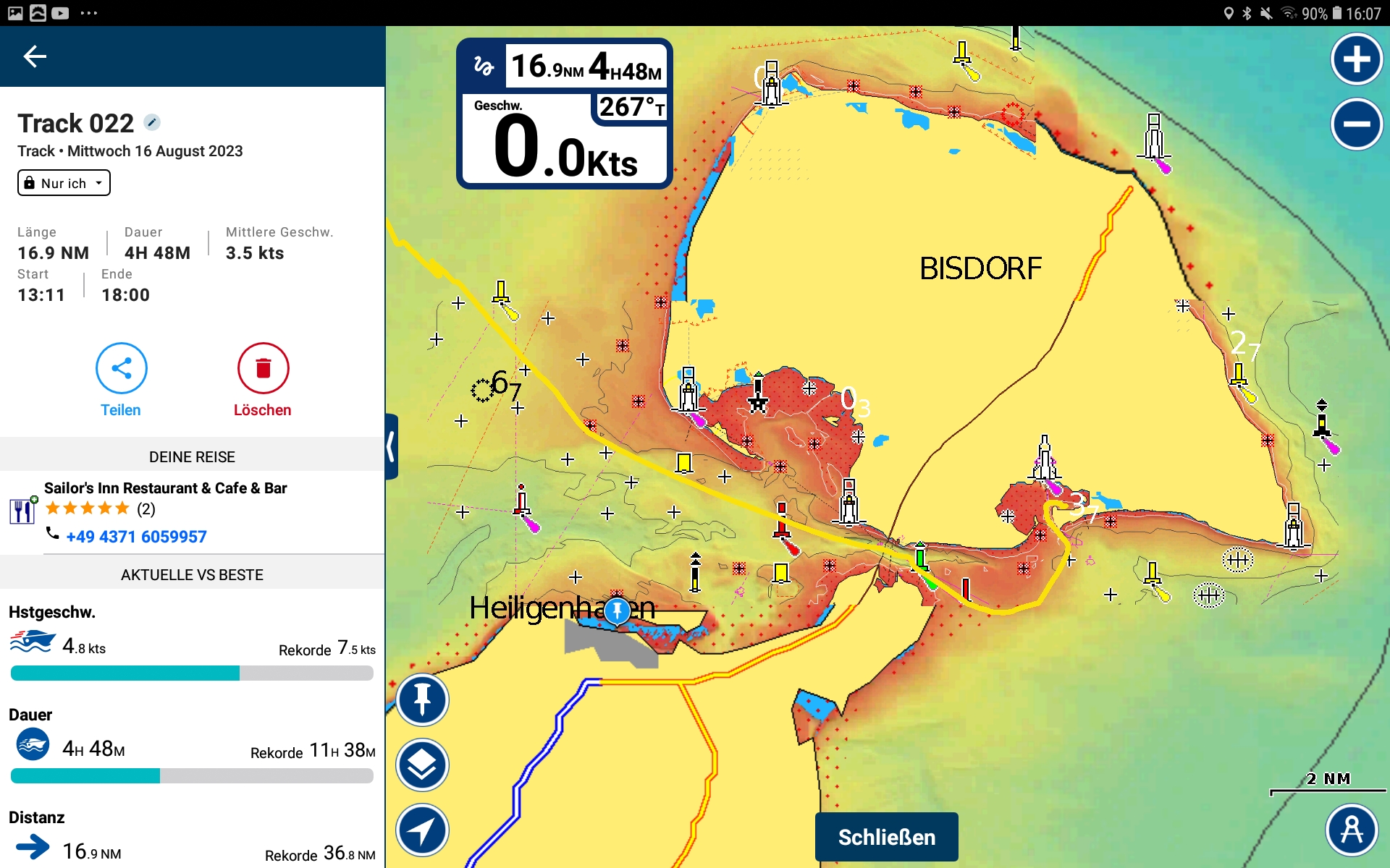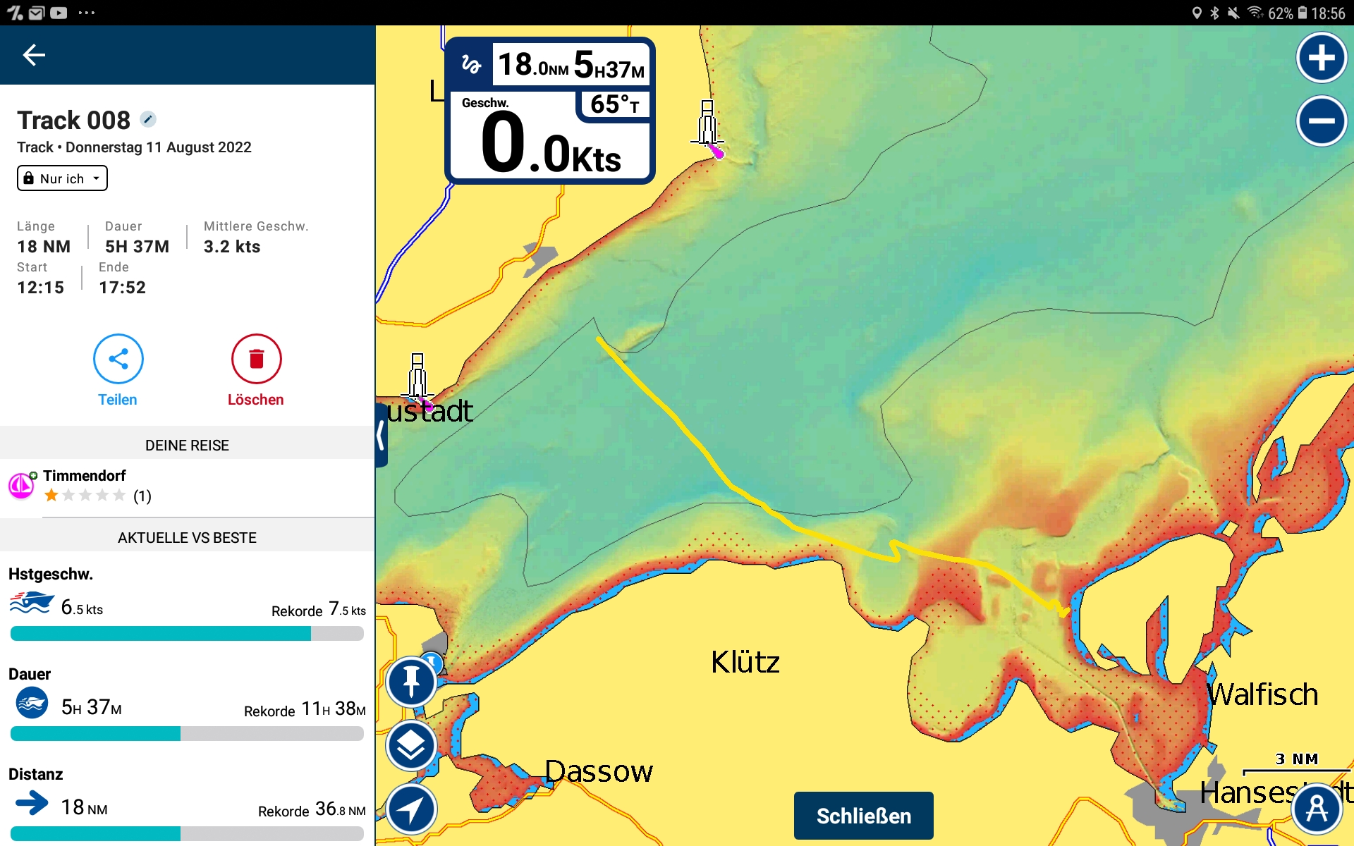 | Bemerkungen: Track 042: Wir entschieden in der Nacht zu fahren, da wir hier besseren Wind haben, als am nächsten Tag. Da hätten wir den Wind nur auf der Nase gehabt und wahrscheinlich 36 sm motoren müssen. Diese Nachtfahrt hatte es in sich: Es wurden 14 - 16 Ktn Wind vorausgesagt, es waren aber dann tatsächlich 18 - 25 Ktn bei 1m kurzer Welle die aber dann vor der Kieler Förde weniger wurde. Es war aber mächtig Bewegung im Schiff. An dieser Fahrt merkt man einfach die Erfahrung von Sepp, der hier sehr viel das Ruder hatte und die Segel sehr gut trimmte. Wir hatten aber ab 00:30 mit starkem Regen zu kämpfen, gut ist hier unsere Sprayhood unter der man sich geschützt aufhalten kann. Da wir den Kurs direkt auf die Kieler Förde nicht halten konnten, mussten wir eine Wende machen und die letzten 9 sm mit Maschine fahren. Wir sind glücklich in Laboe um 05:10 Uhr eingelaufen, mussten allerdings noch ca. 30min einen freien Liegeplatz suchen. Übermorgen startet hier in Kiel ein großes Event mit einem Fest für das Ocean Race Europe, welches am 10. August startet. Boris Hermann wird hier mit seiner Crew starten. Er wird uns vermutlich, ausser wir sind schneller ;-), auf der Nordsee überholen, vielleicht sende ich einen Funkspruch zu Boris ob ich zur Seite gehen soll :-)