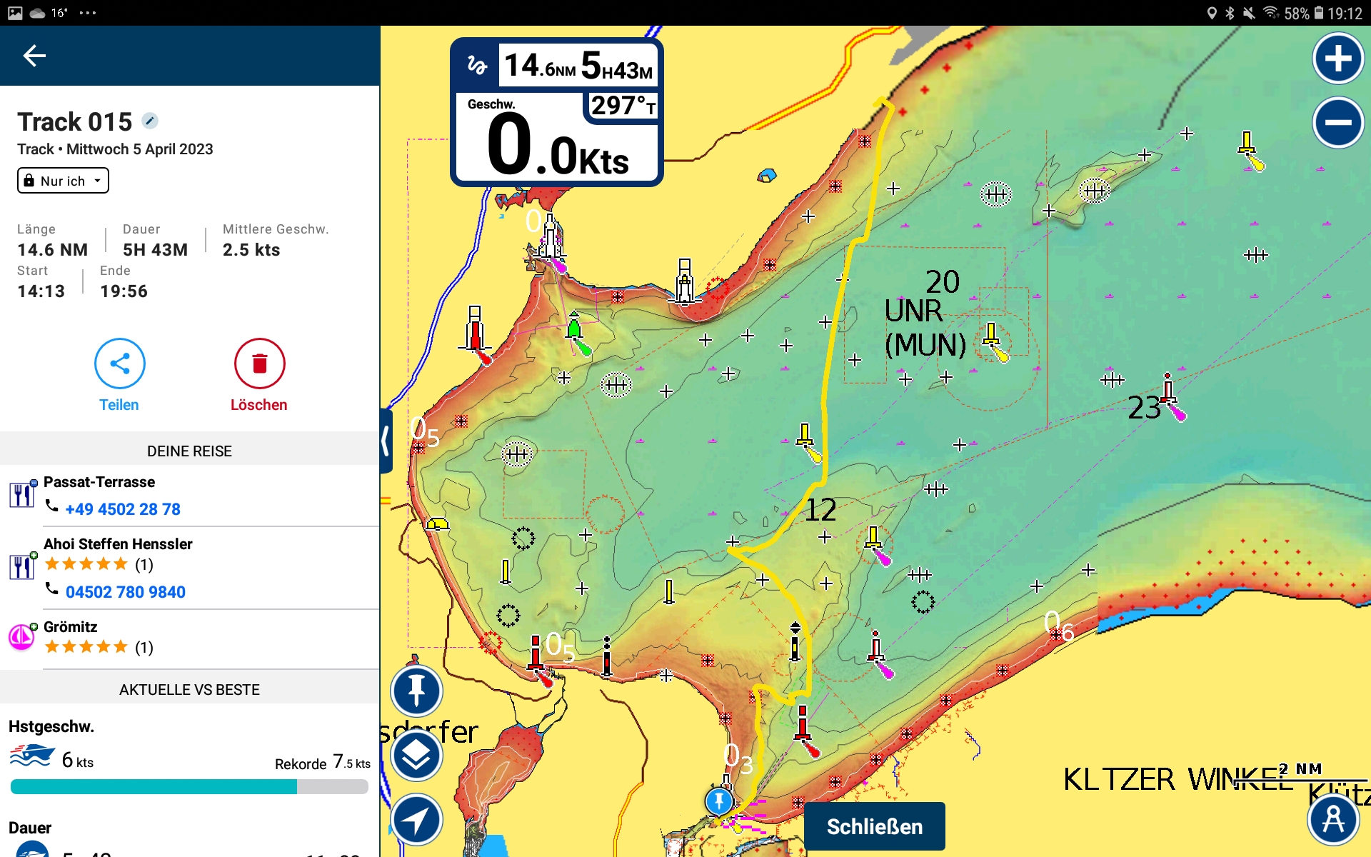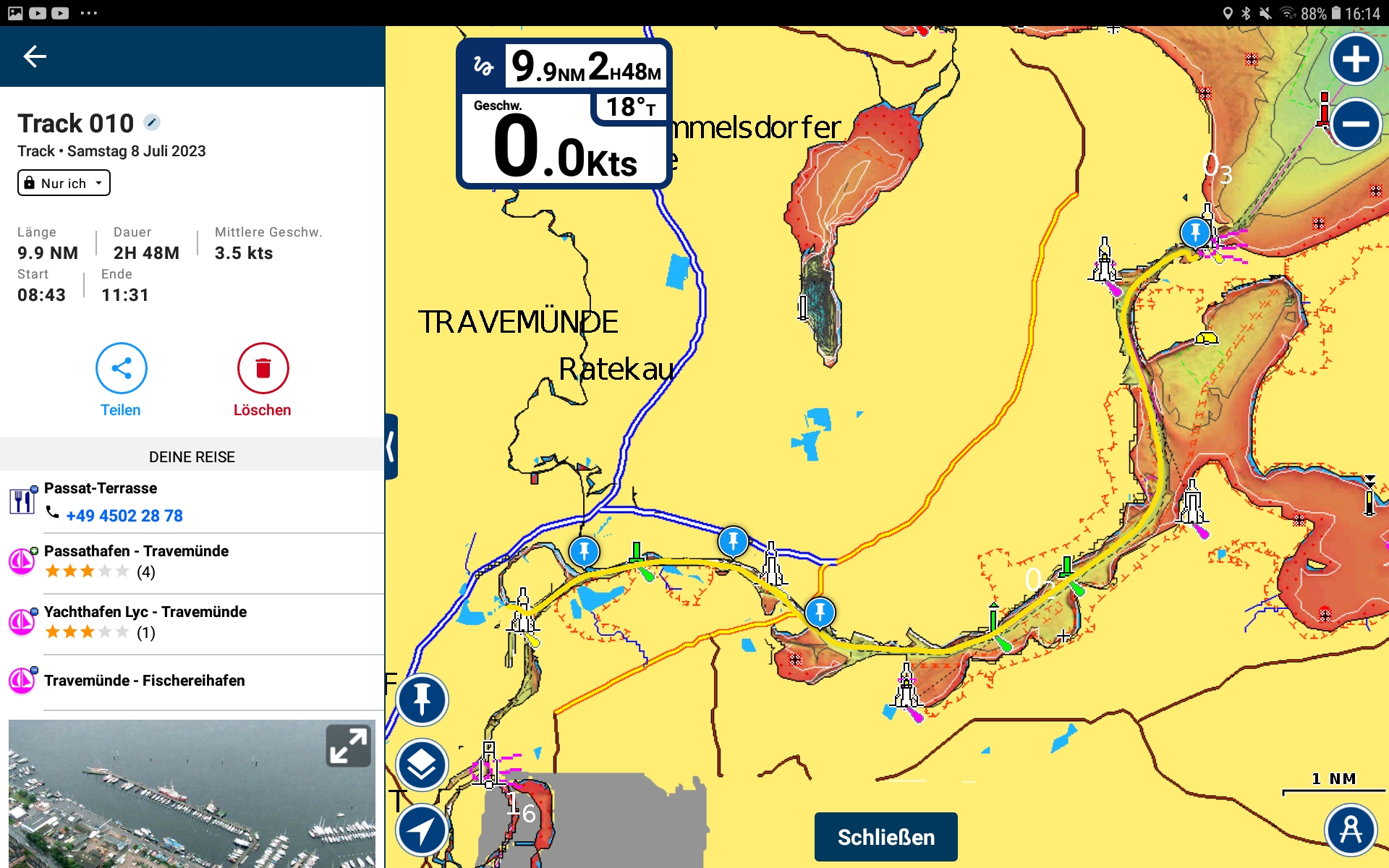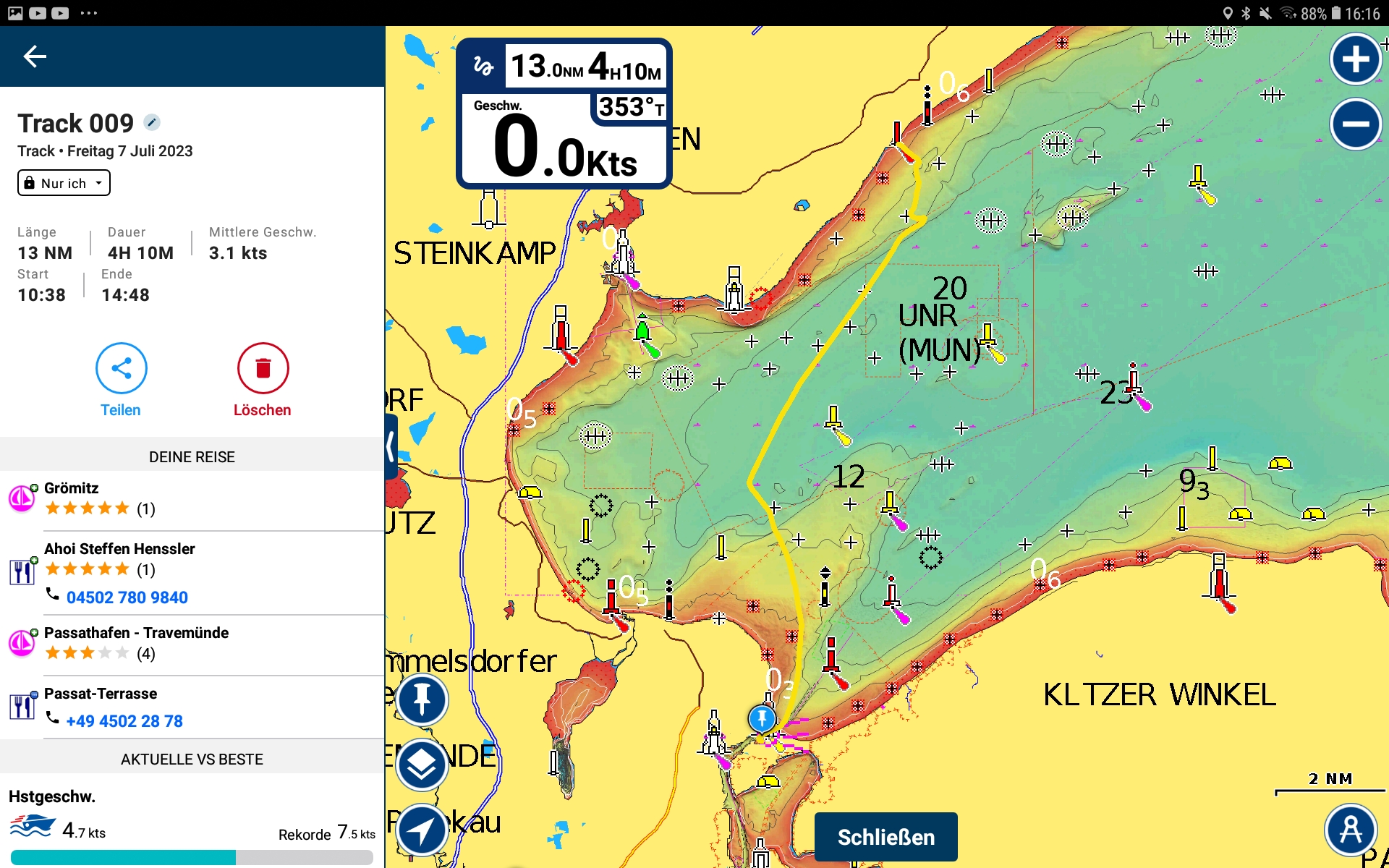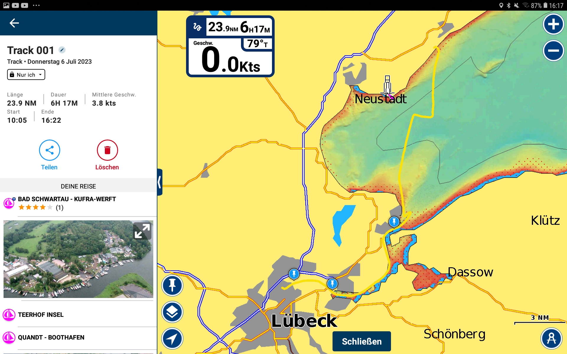 | Bemerkungen: Track 042: Wir entschieden in der Nacht zu fahren, da wir hier besseren Wind haben, als am nächsten Tag. Da hätten wir den Wind nur auf der Nase gehabt und wahrscheinlich 36 sm motoren müssen. Diese Nachtfahrt hatte es in sich: Es wurden 14 - 16 Ktn Wind vorausgesagt, es waren aber dann tatsächlich 18 - 25 Ktn bei 1m kurzer Welle die aber dann vor der Kieler Förde weniger wurde. Es war aber mächtig Bewegung im Schiff. An dieser Fahrt merkt man einfach die Erfahrung von Sepp, der hier sehr viel das Ruder hatte und die Segel sehr gut trimmte. Wir hatten aber ab 00:30 mit starkem Regen zu kämpfen, gut ist hier unsere Sprayhood unter der man sich geschützt aufhalten kann. Da wir den Kurs direkt auf die Kieler Förde nicht halten konnten, mussten wir eine Wende machen und die letzten 9 sm mit Maschine fahren. Wir sind glücklich in Laboe um 05:10 Uhr eingelaufen, mussten allerdings noch ca. 30min einen freien Liegeplatz suchen. Übermorgen startet hier in Kiel ein großes Event mit einem Fest für das Ocean Race Europe, welches am 10. August startet. Boris Hermann wird hier mit seiner Crew starten. Er wird uns vermutlich, ausser wir sind schneller ;-), auf der Nordsee überholen, vielleicht sende ich einen Funkspruch zu Boris ob ich zur Seite gehen soll :-)