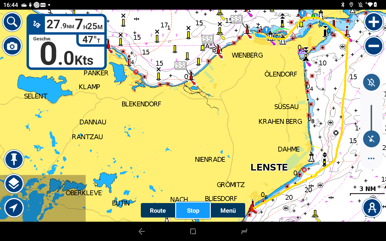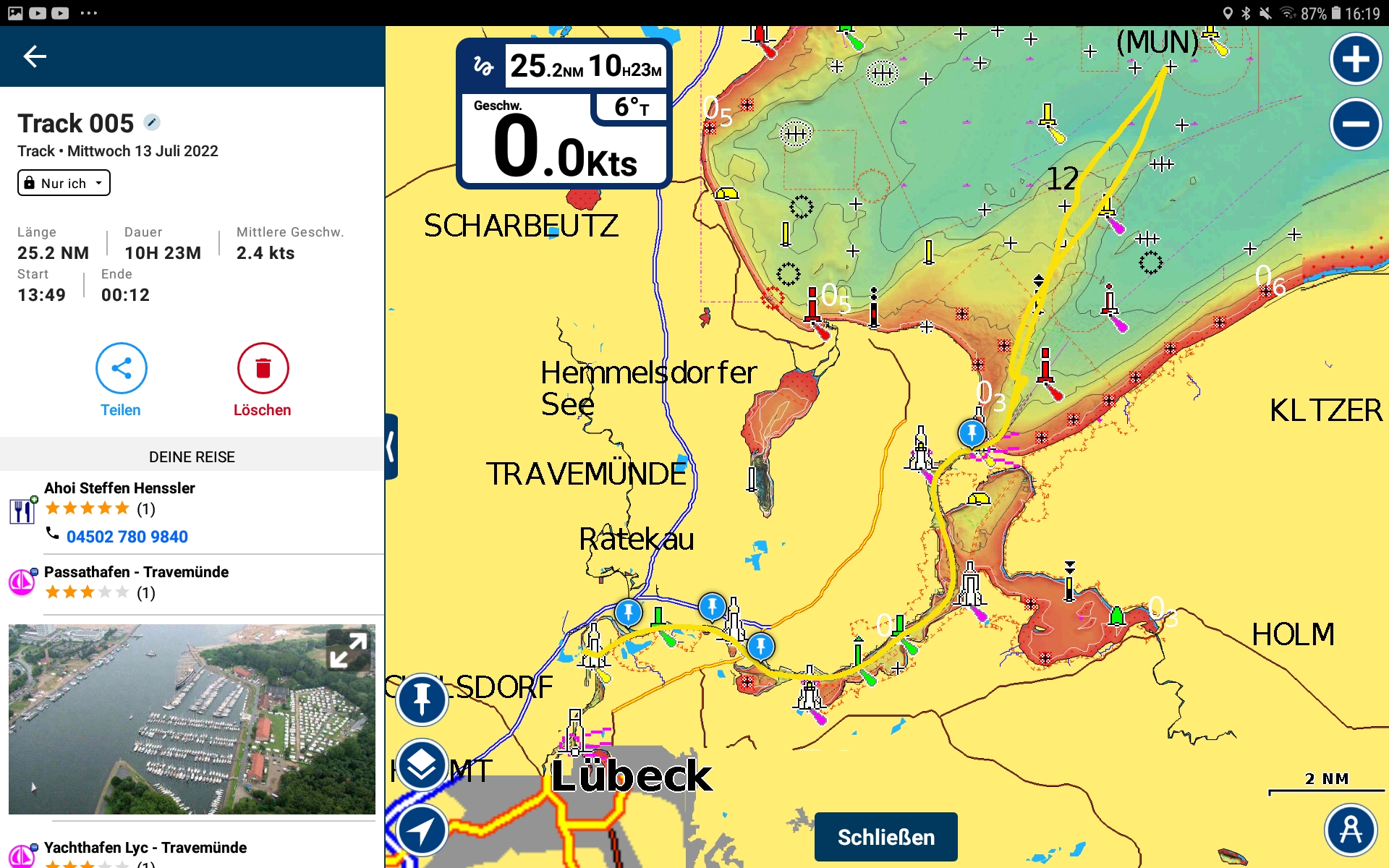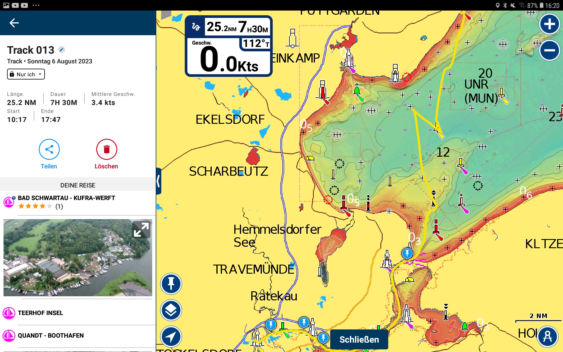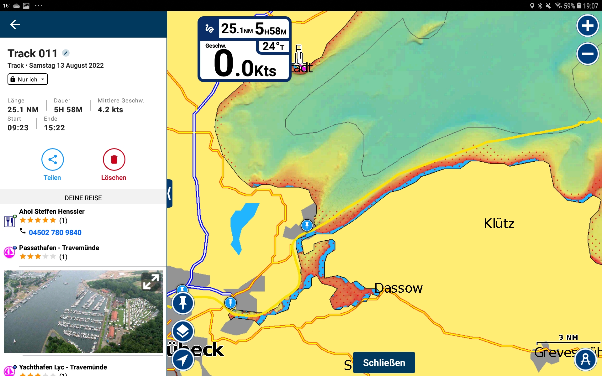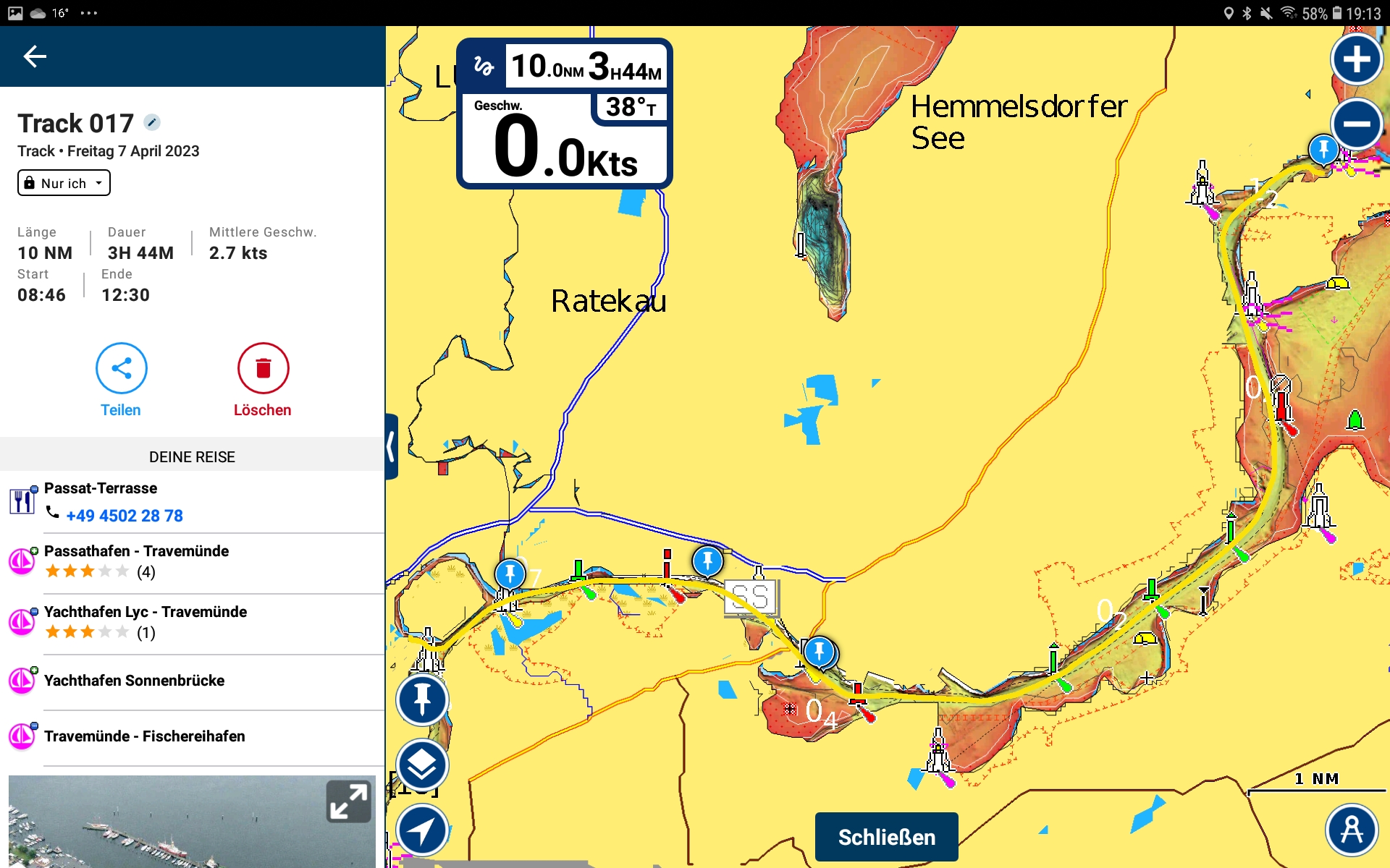 | Bemerkungen: Track 042: Wir entschieden in der Nacht zu fahren, da wir hier besseren Wind haben, als am nächsten Tag. Da hätten wir den Wind nur auf der Nase gehabt und wahrscheinlich 36 sm motoren müssen. Diese Nachtfahrt hatte es in sich: Es wurden 14 - 16 Ktn Wind vorausgesagt, es waren aber dann tatsächlich 18 - 25 Ktn bei 1m kurzer Welle die aber dann vor der Kieler Förde weniger wurde. Es war aber mächtig Bewegung im Schiff. An dieser Fahrt merkt man einfach die Erfahrung von Sepp, der hier sehr viel das Ruder hatte und die Segel sehr gut trimmte. Wir hatten aber ab 00:30 mit starkem Regen zu kämpfen, gut ist hier unsere Sprayhood unter der man sich geschützt aufhalten kann. Da wir den Kurs direkt auf die Kieler Förde nicht halten konnten, mussten wir eine Wende machen und die letzten 9 sm mit Maschine fahren. Wir sind glücklich in Laboe um 05:10 Uhr eingelaufen, mussten allerdings noch ca. 30min einen freien Liegeplatz suchen. Übermorgen startet hier in Kiel ein großes Event mit einem Fest für das Ocean Race Europe, welches am 10. August startet. Boris Hermann wird hier mit seiner Crew starten. Er wird uns vermutlich, ausser wir sind schneller ;-), auf der Nordsee überholen, vielleicht sende ich einen Funkspruch zu Boris ob ich zur Seite gehen soll :-)