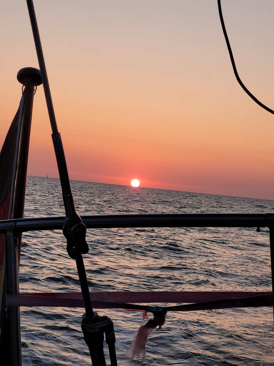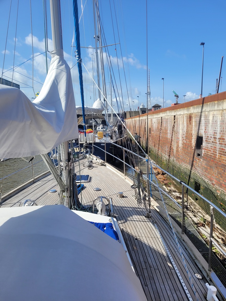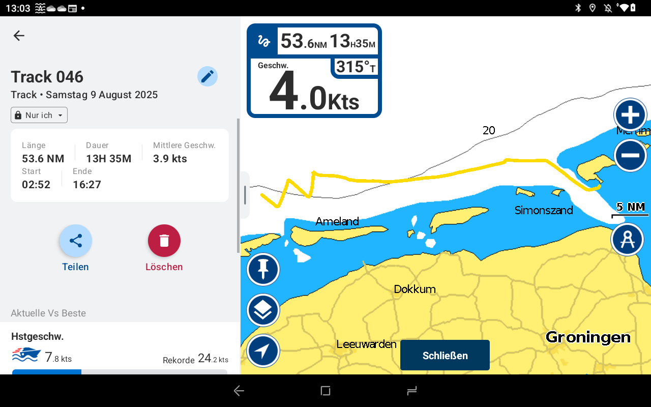 | Bemerkungen: Track 042: Wir entschieden in der Nacht zu fahren, da wir hier besseren Wind haben, als am nächsten Tag. Da hätten wir den Wind nur auf der Nase gehabt und wahrscheinlich 36 sm motoren müssen. Diese Nachtfahrt hatte es in sich: Es wurden 14 - 16 Ktn Wind vorausgesagt, es waren aber dann tatsächlich 18 - 25 Ktn bei 1m kurzer Welle die aber dann vor der Kieler Förde weniger wurde. Es war aber mächtig Bewegung im Schiff. An dieser Fahrt merkt man einfach die Erfahrung von Sepp, der hier sehr viel das Ruder hatte und die Segel sehr gut trimmte. Wir hatten aber ab 00:30 mit starkem Regen zu kämpfen, gut ist hier unsere Sprayhood unter der man sich geschützt aufhalten kann. Da wir den Kurs direkt auf die Kieler Förde nicht halten konnten, mussten wir eine Wende machen und die letzten 9 sm mit Maschine fahren. Wir sind glücklich in Laboe um 05:10 Uhr eingelaufen, mussten allerdings noch ca. 30min einen freien Liegeplatz suchen. Übermorgen startet hier in Kiel ein großes Event mit einem Fest für das Ocean Race Europe, welches am 10. August startet. Boris Hermann wird hier mit seiner Crew starten. Er wird uns vermutlich, ausser wir sind schneller ;-), auf der Nordsee überholen, vielleicht sende ich einen Funkspruch zu Boris ob ich zur Seite gehen soll :-)